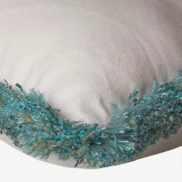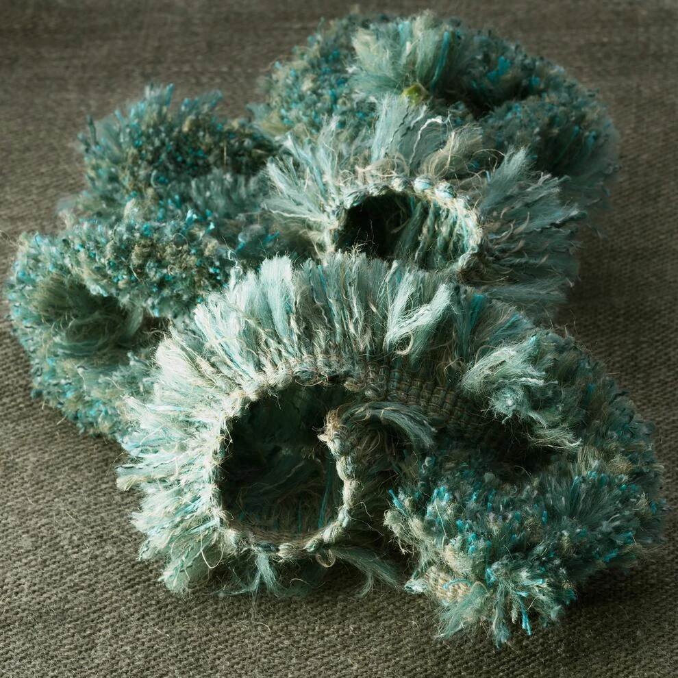 the intermingling deep-turquoise threads of the surrounding fringe,