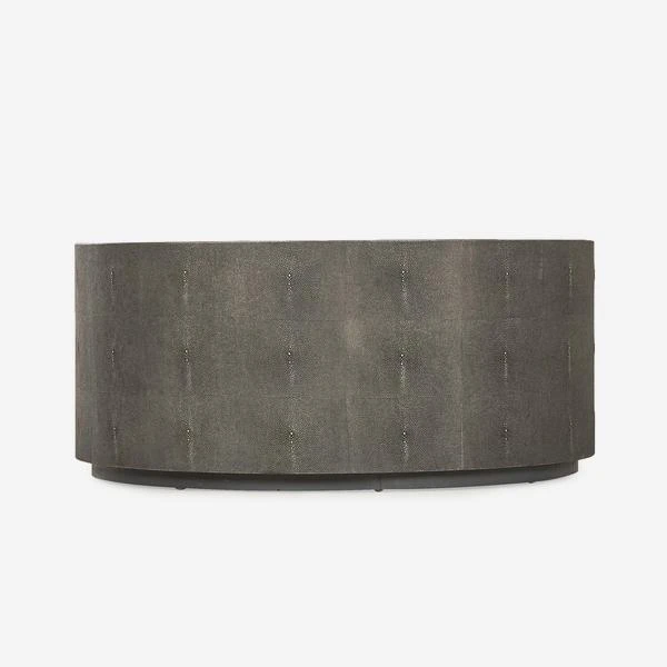 A circular coffee table in all-over charcoal faux shagreen.