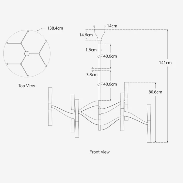 This modern chandelier is dynamic in its form, extending out