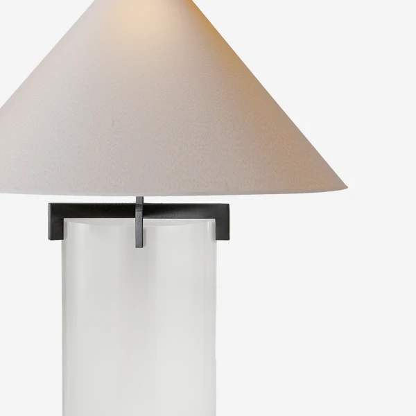 transparent crystal base, a cream linen shade and black iron