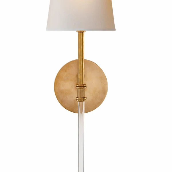 A petite wall lamp in hand-rubbed antique brass with a linen