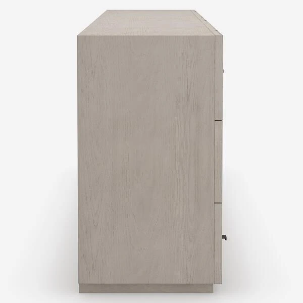 a neutral taupe finish. Features six spacious drawers with minimal
