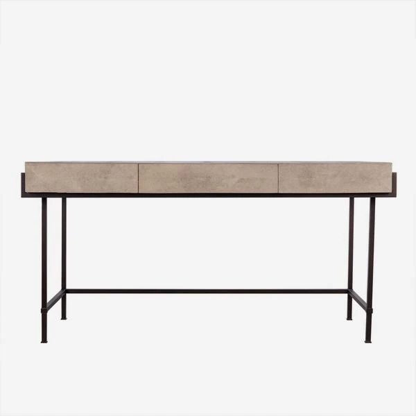 A faux shagreen top desk in cream on a slim, iron frame,