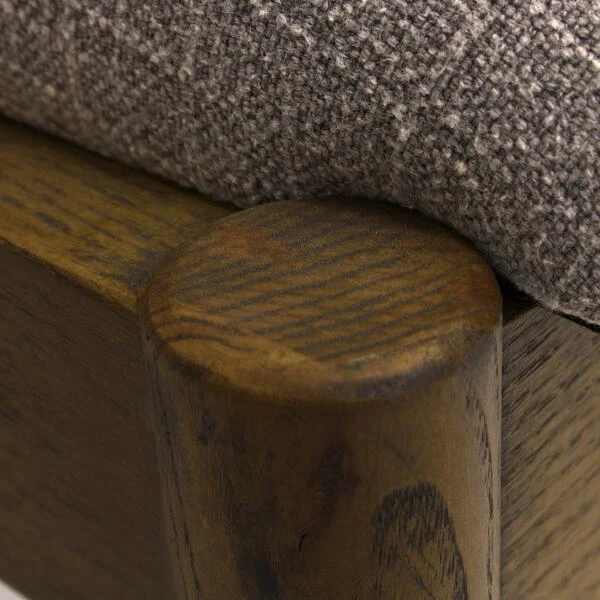 wood frame with a back and seat upholstered in cool, grey coloured