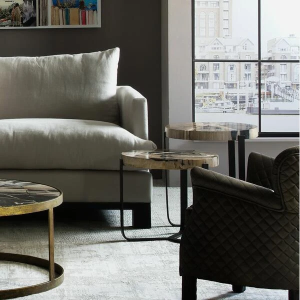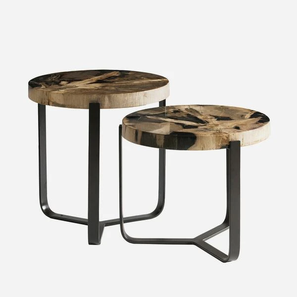iron tripod style legs are topped with a chunky slab of petrified