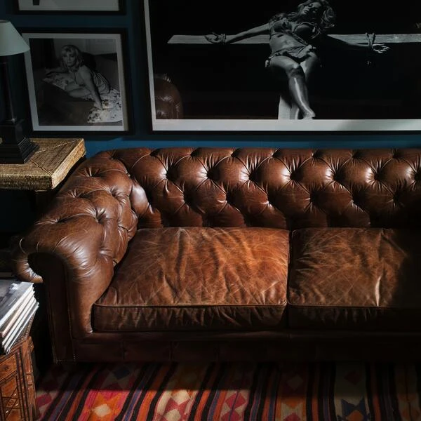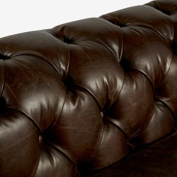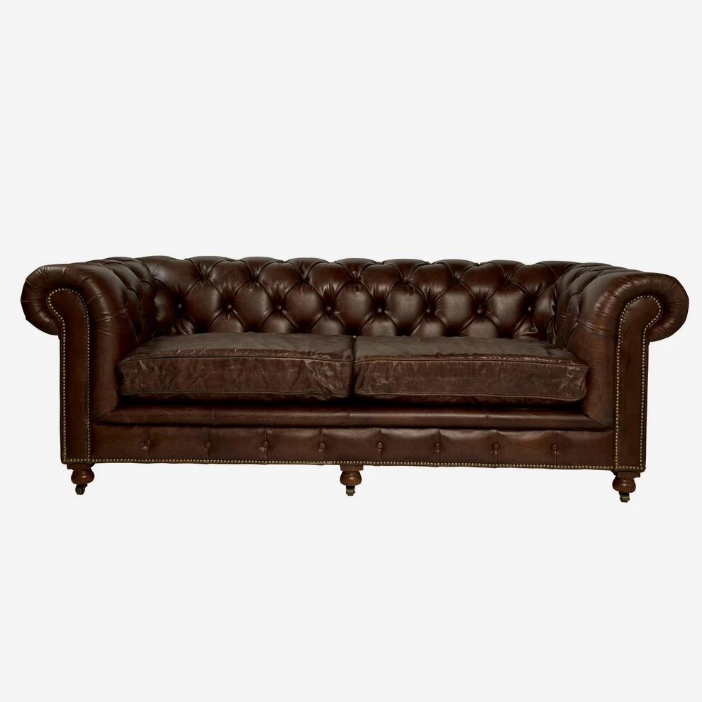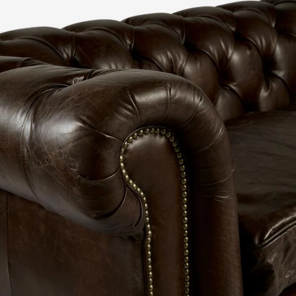 A three-seater distressed leather sofa in dark fudge. Rebel is a